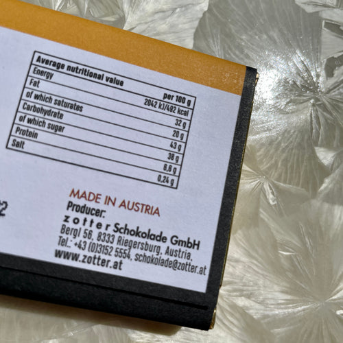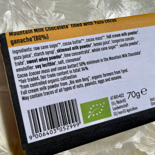 Part tangerine, part lime with a wicked flavor of sun-ripened tangerines – that’s Yuzu, the top chefs’ new trendy ingredient. We use white chocolate, Yuzu juice from Japan, lovely tangerine and a bit of lemon juice to create a fruity, refreshing chocolate ganache that tastes like summer sun, and all of this is covered in a milk chocolate coat with a 50% cocoa content.