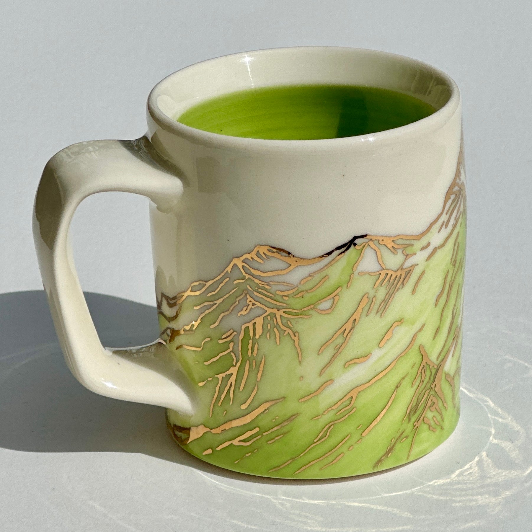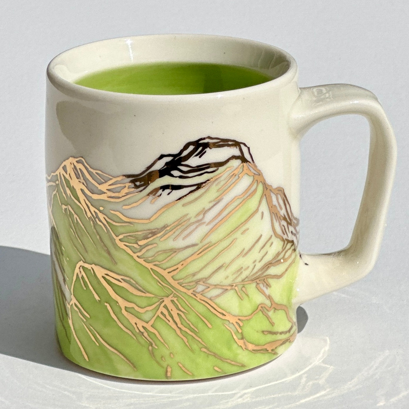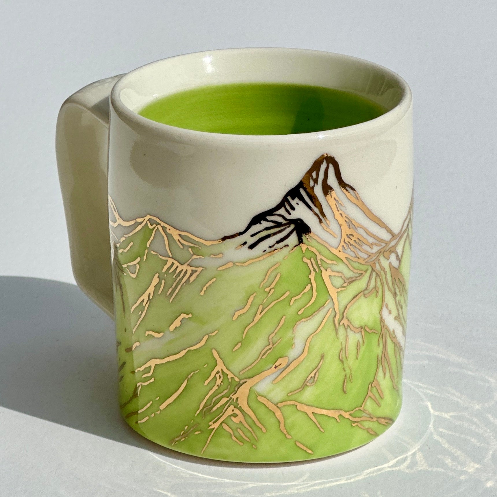 The sparkle on the green mountains on this mug is 24k gold! The gold is applied to the glazed piece and the mug is fired an additional time.