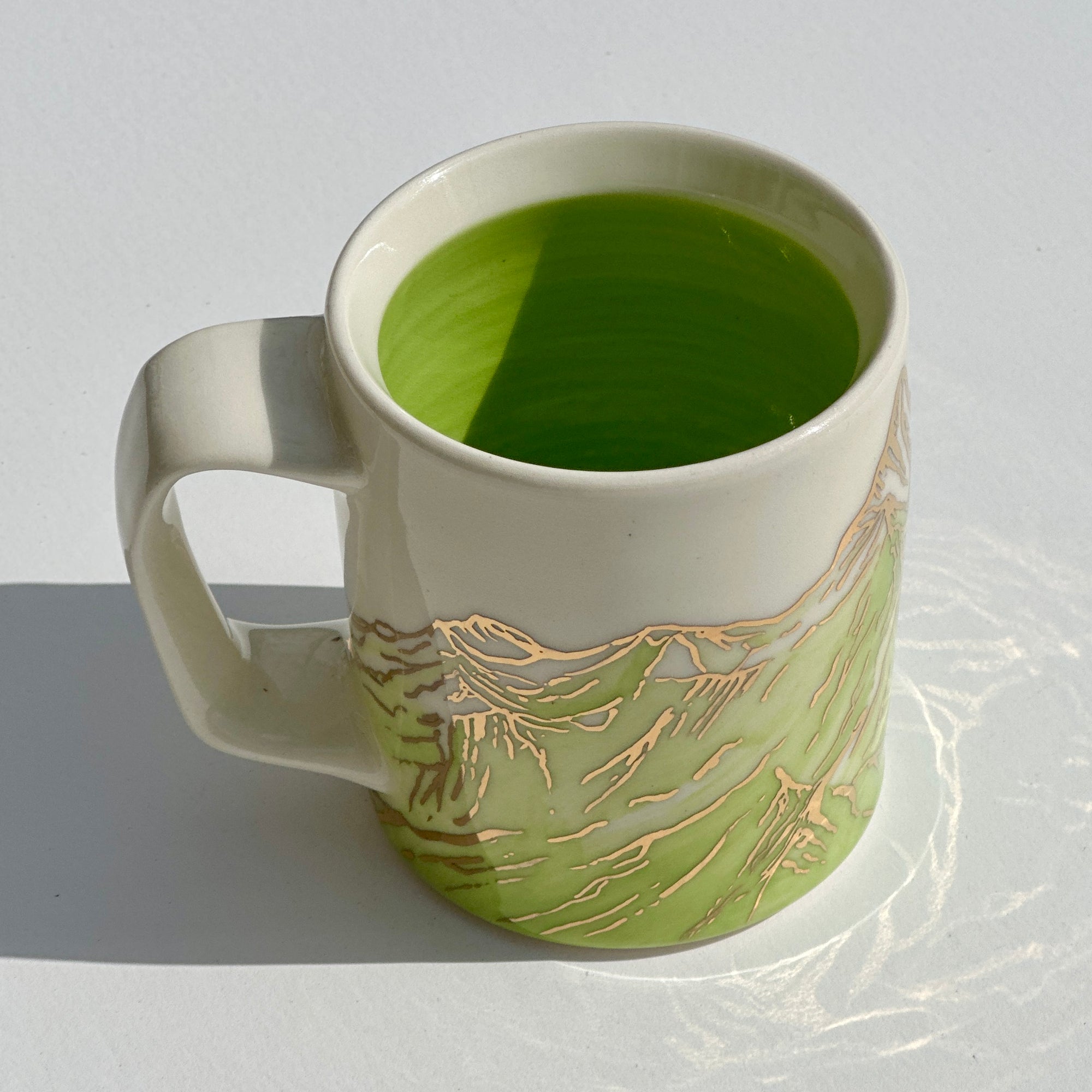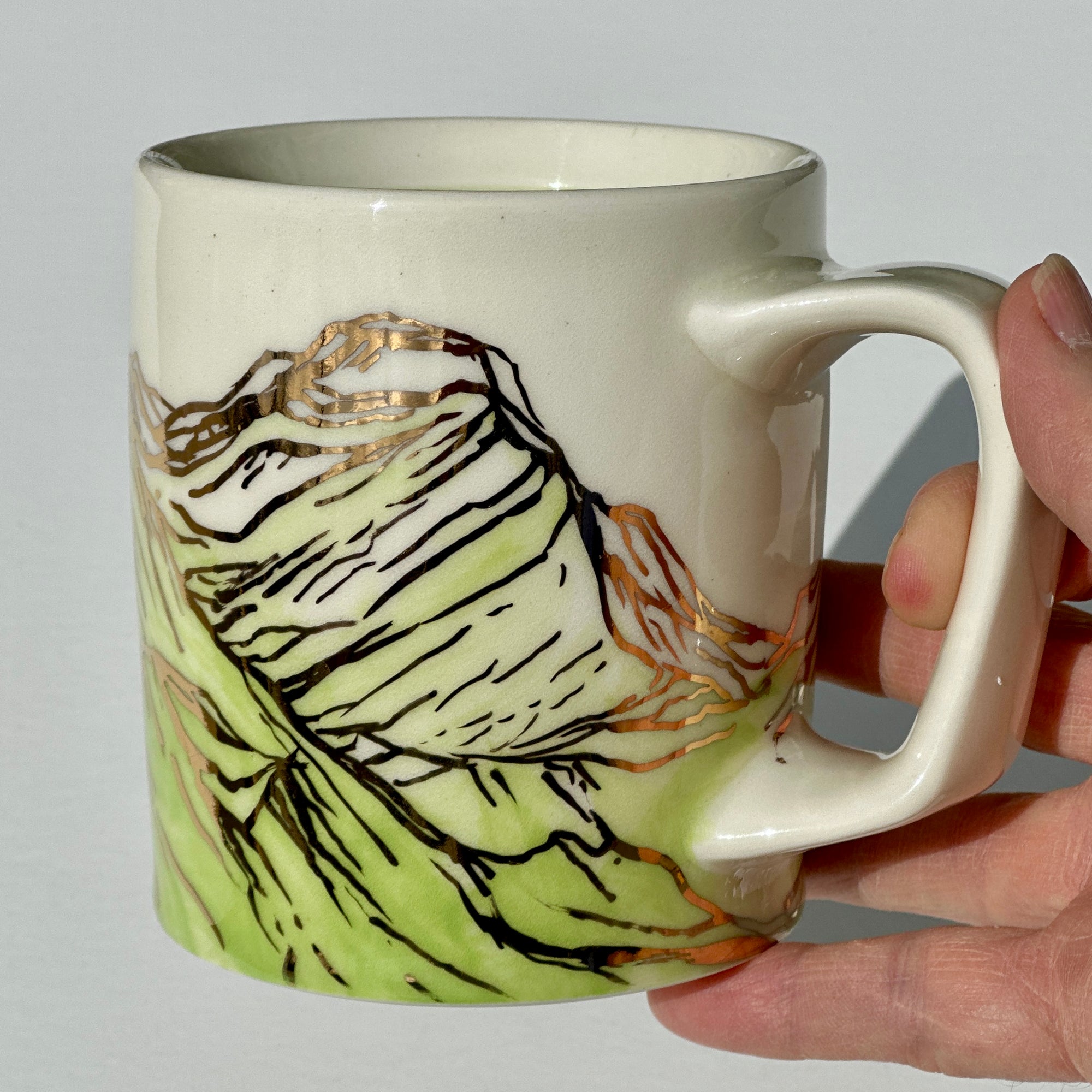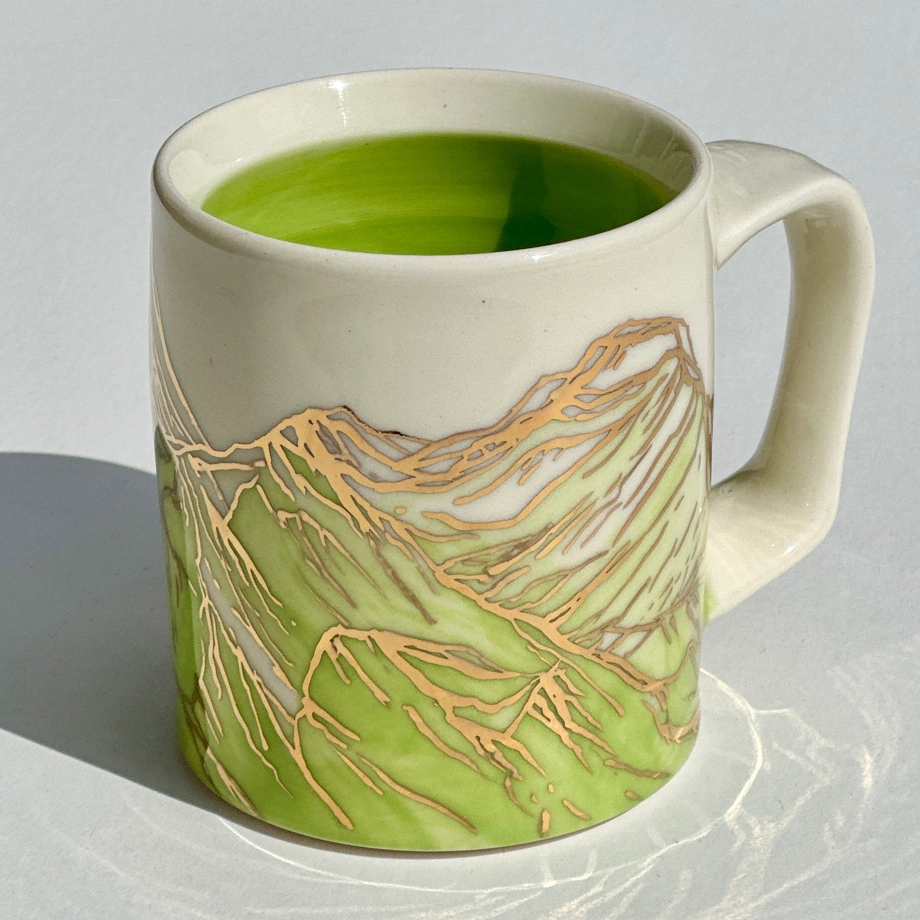 The sparkle on the green mountains on this mug is 24k gold! The gold is applied to the glazed piece and the mug is fired an additional time.