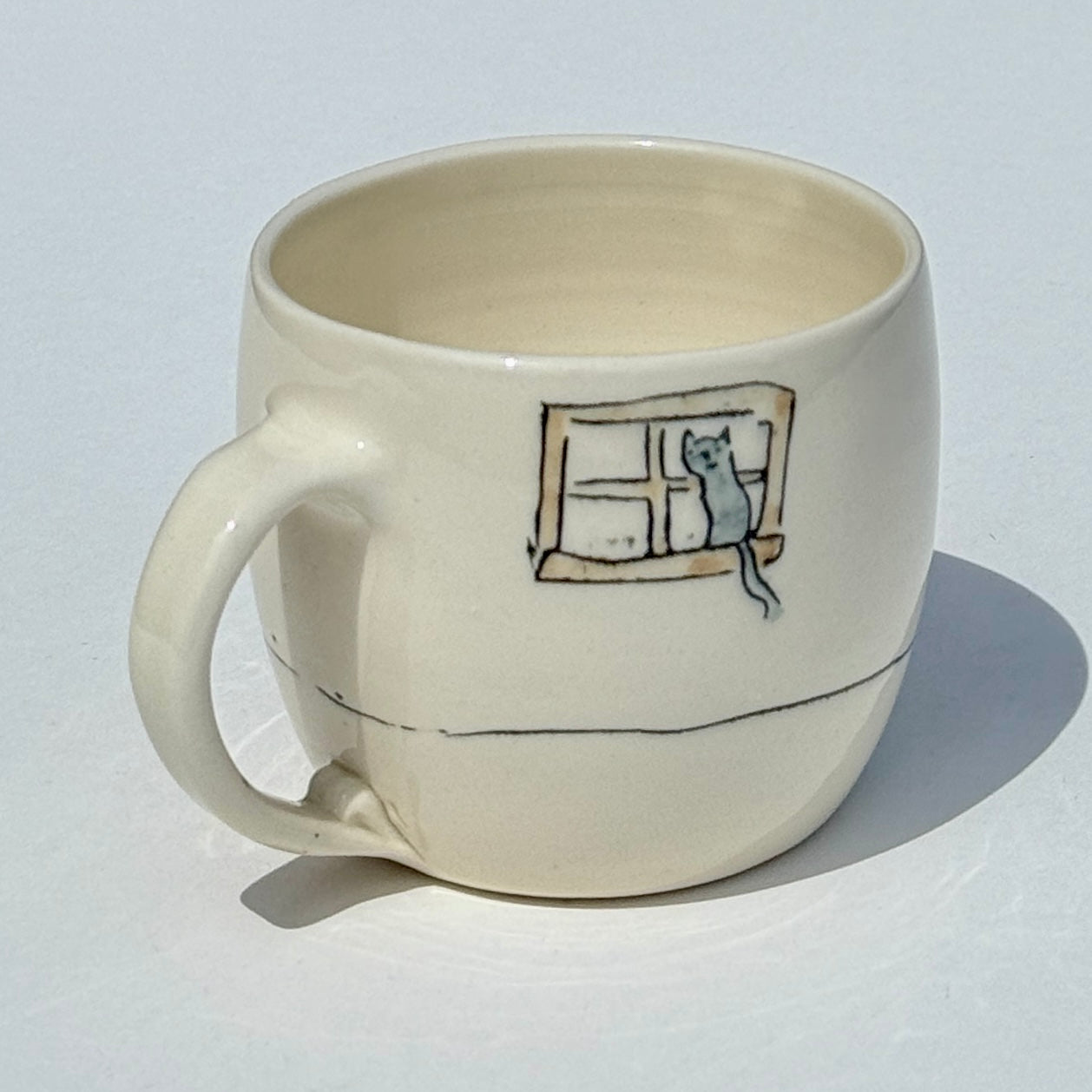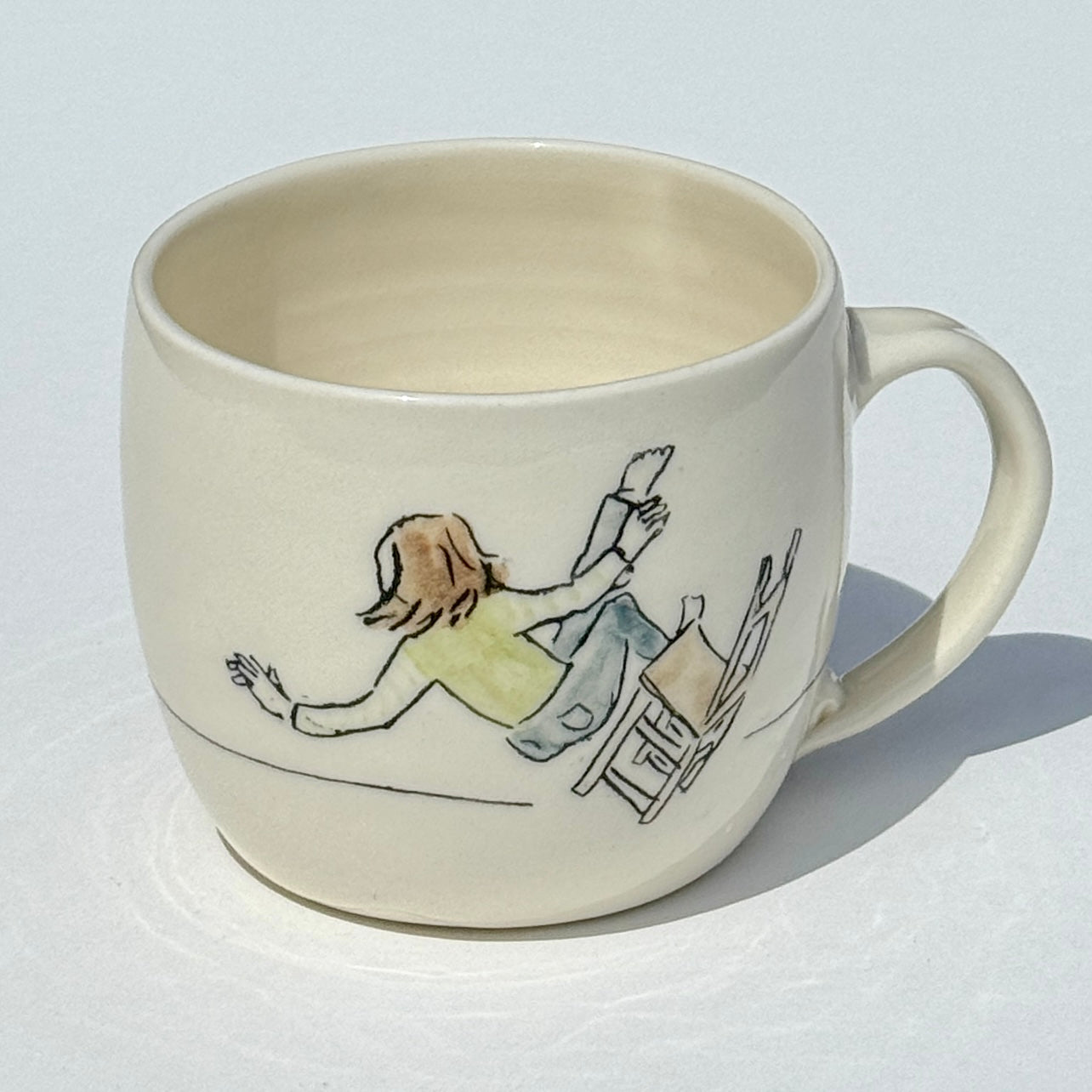 Porcelain mug with hand drawn picture of a person falling over in their chair.