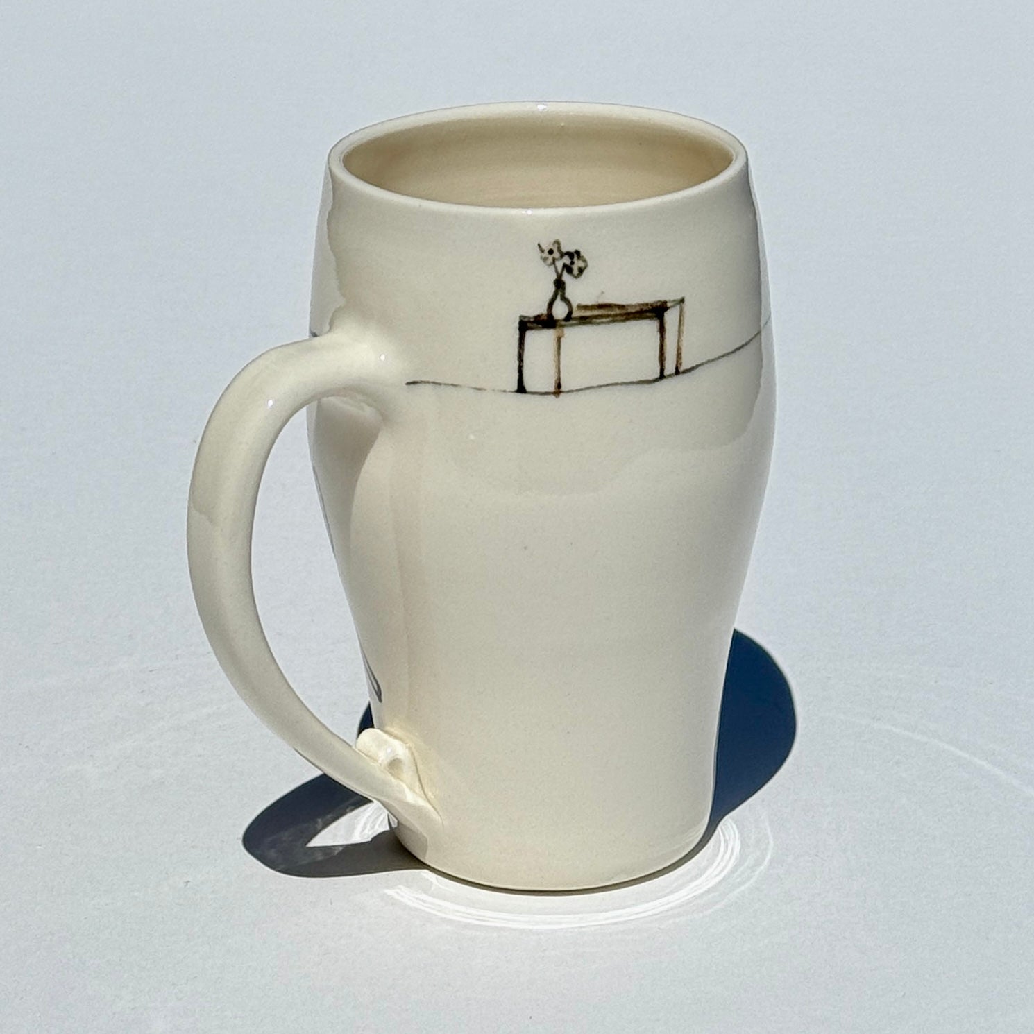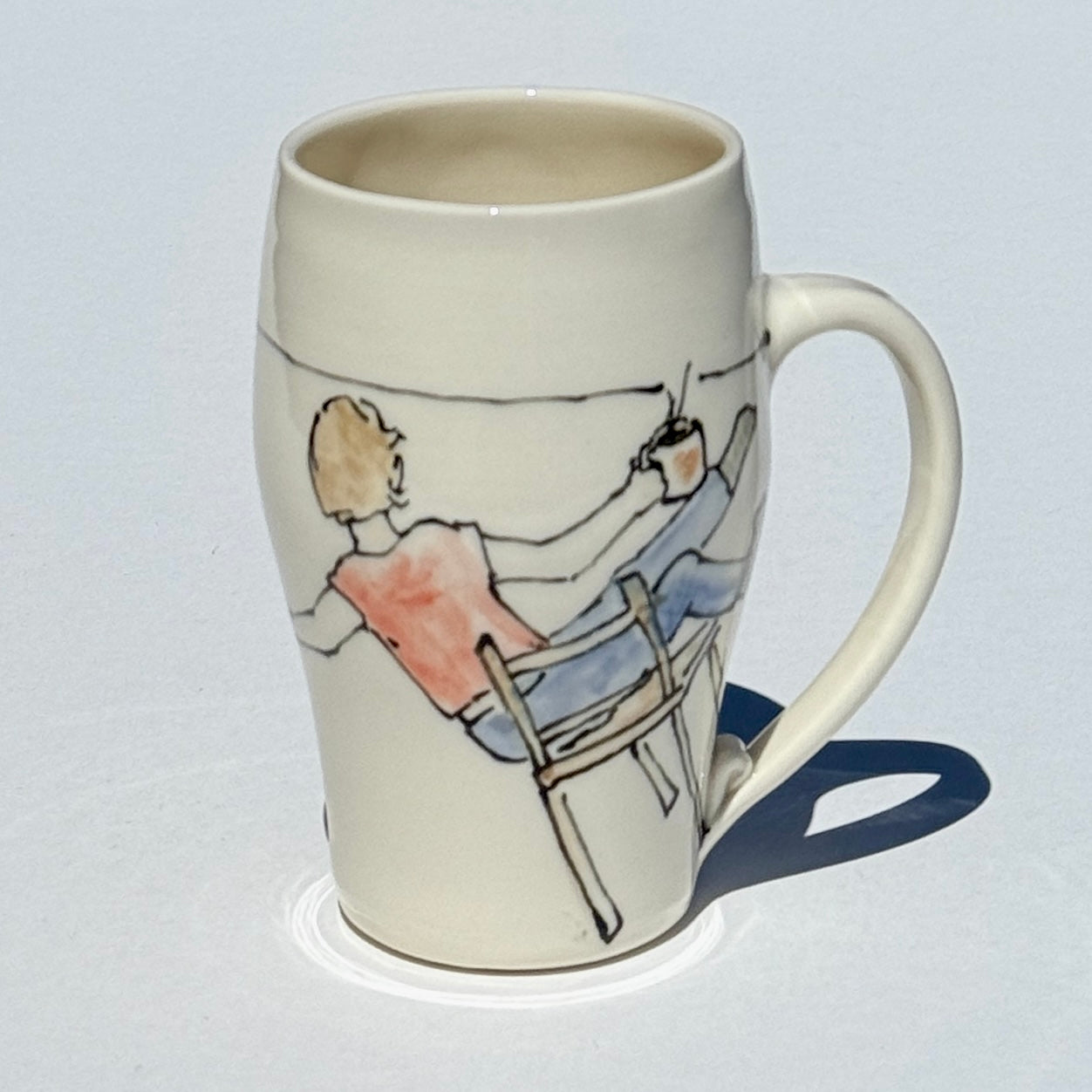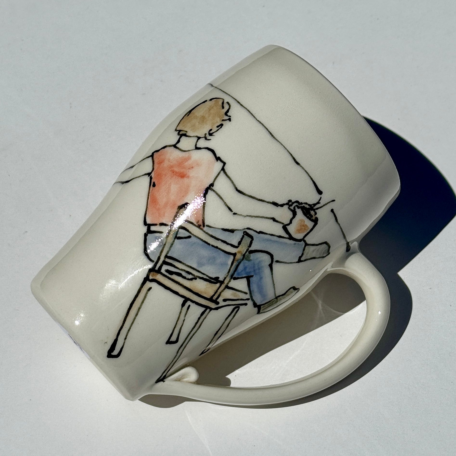Porcelain mug with hand drawn picture of a person falling over in their chair.