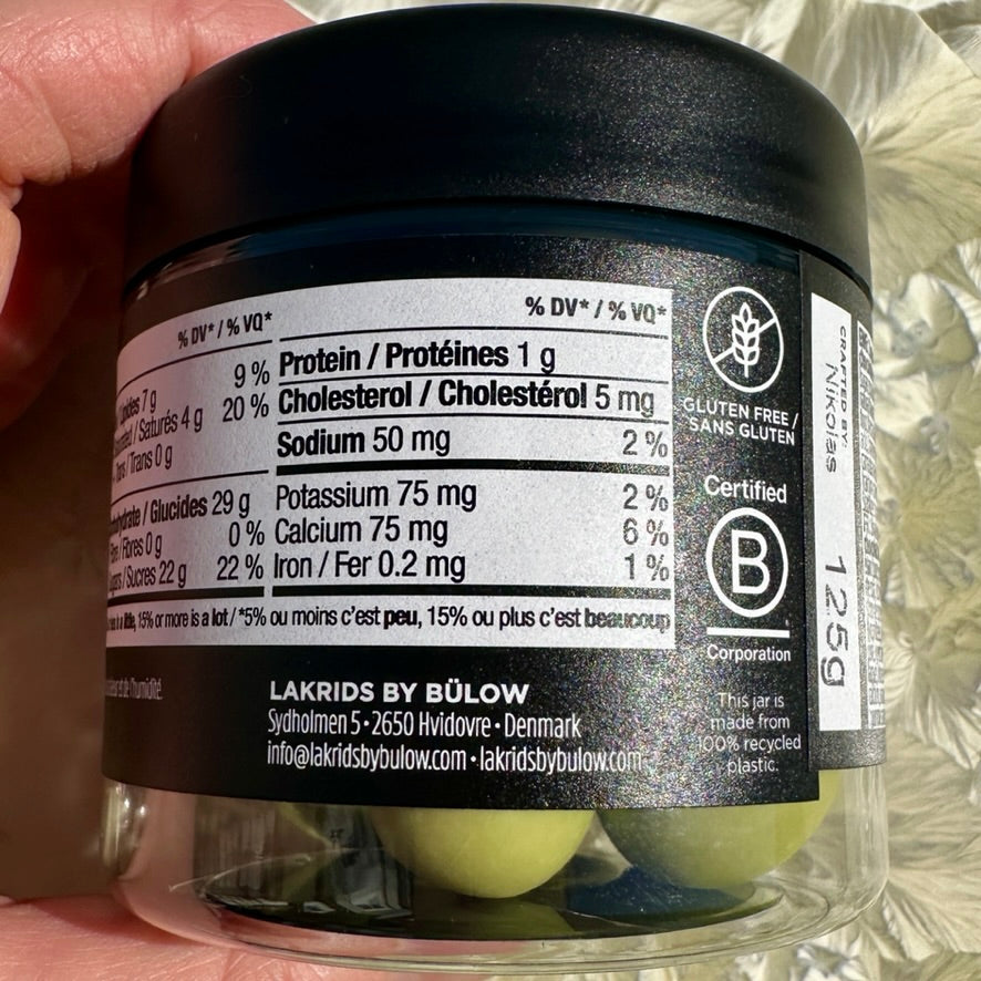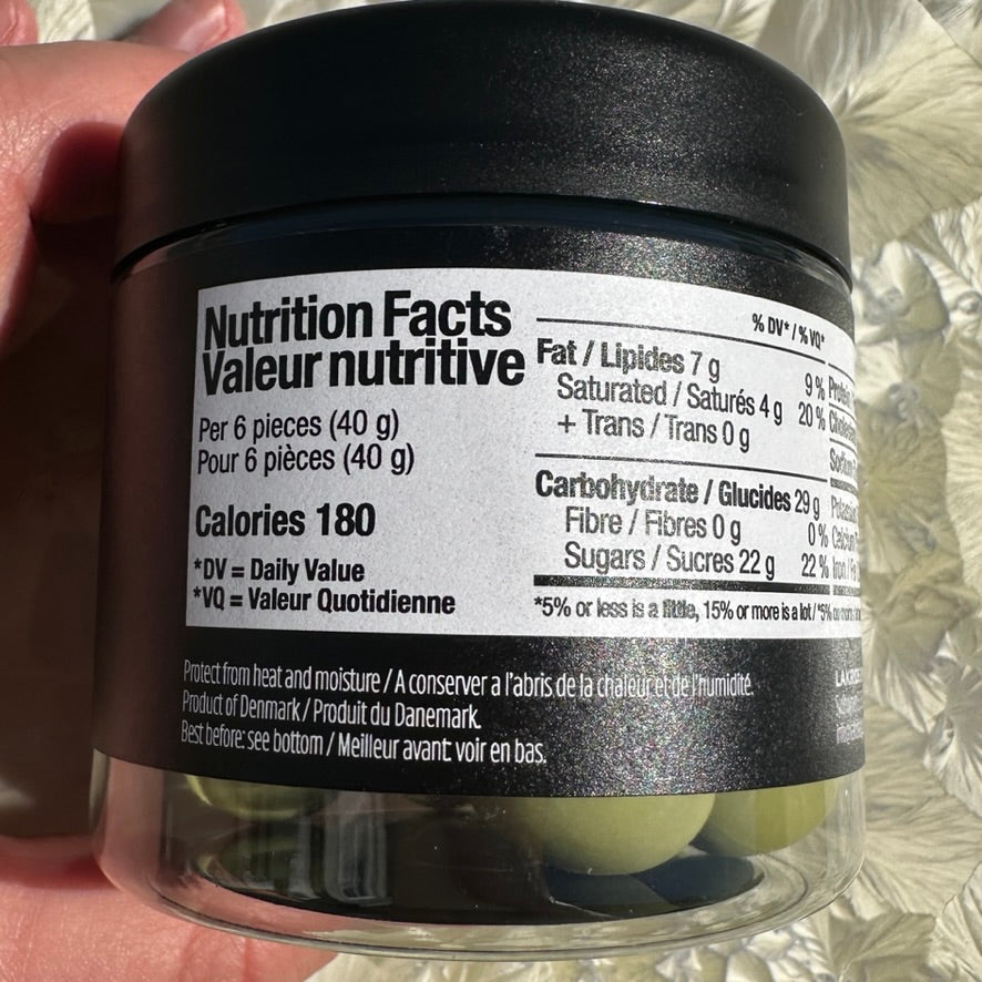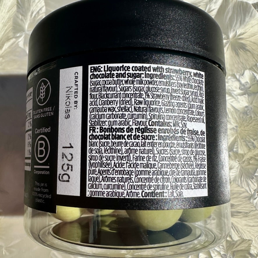 Imagine freshly picked green strawberries together with exquisite red liquorice in a sweet, fruity bite. Enjoy how fresh and sour notes from crispy, green strawberries are perfectly balanced with chewy red liquorice, all swirled in silky white chocolate and a crunchy, green sugar shell for an extra sour twist.