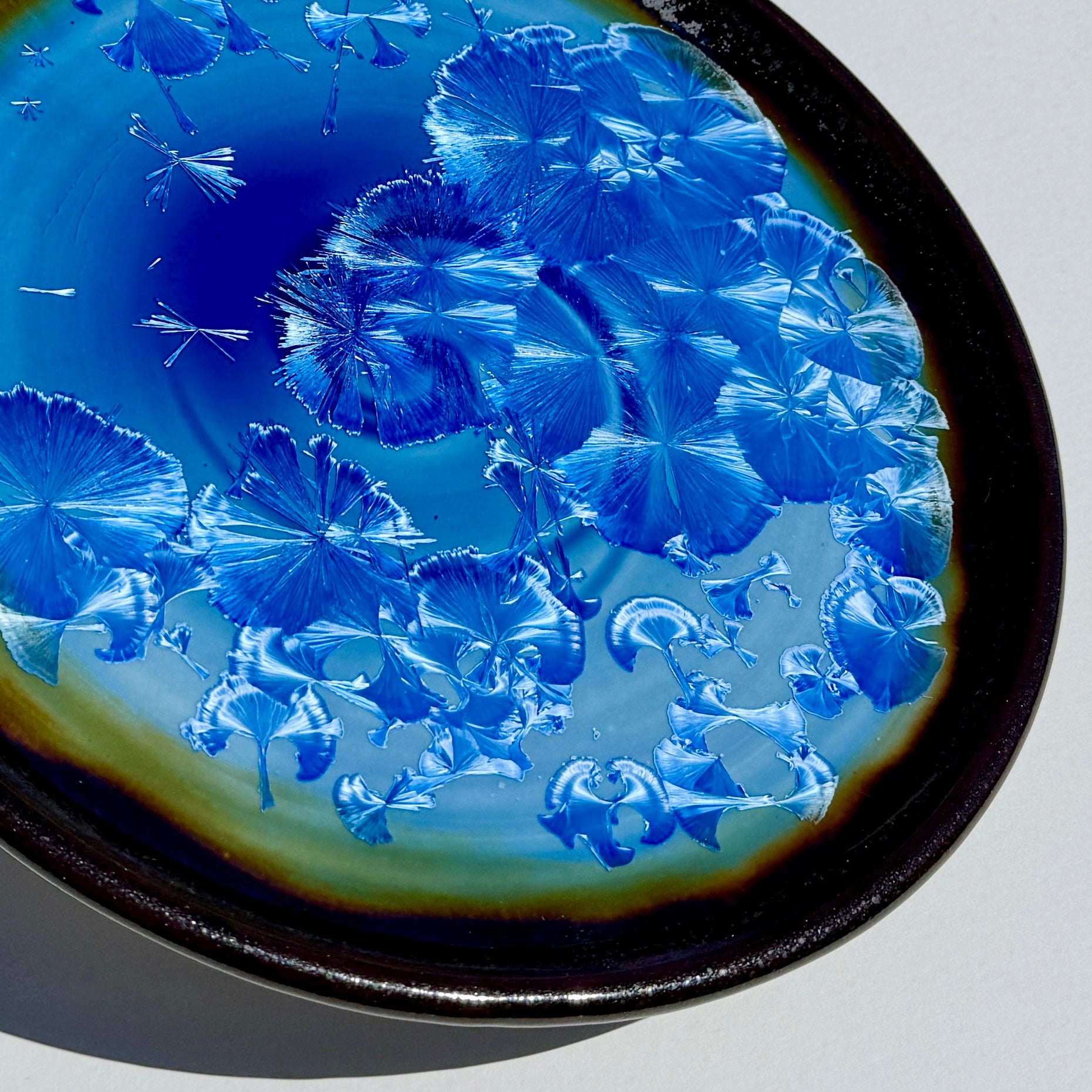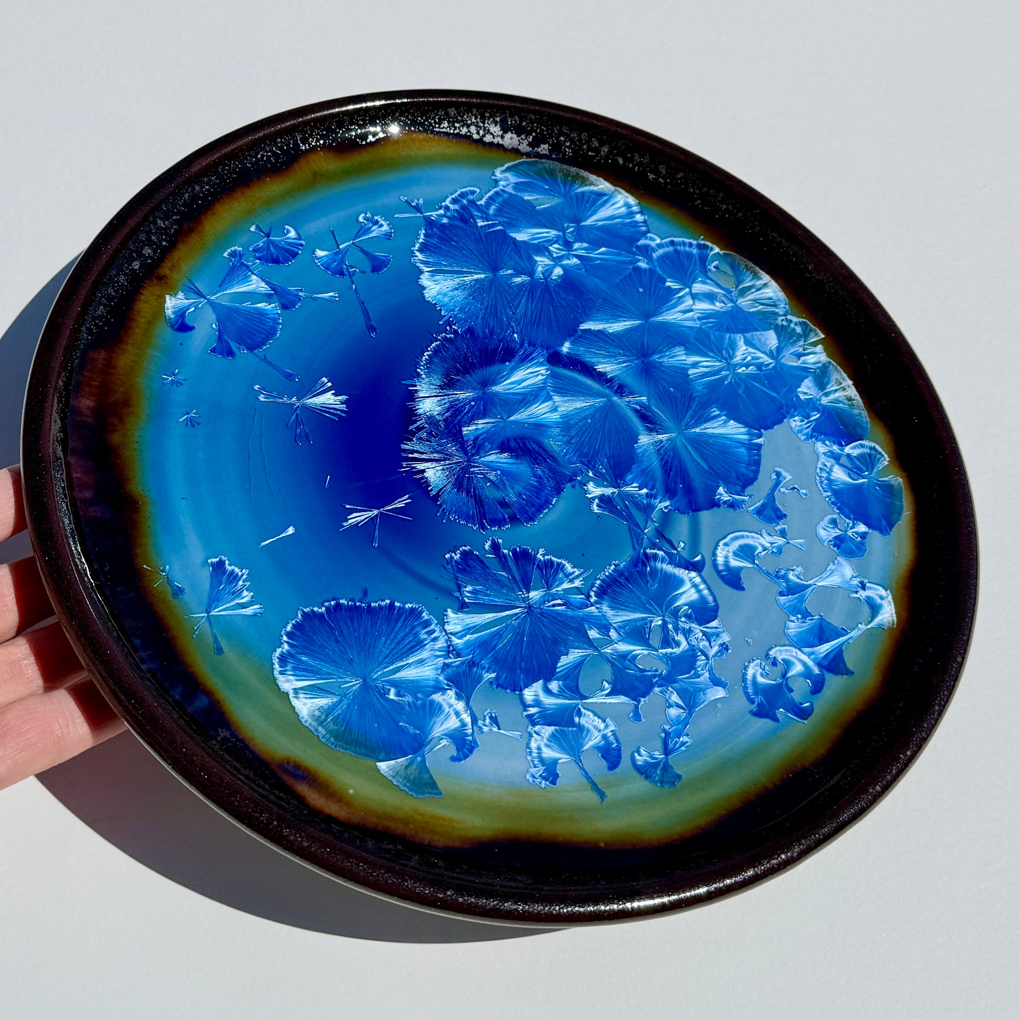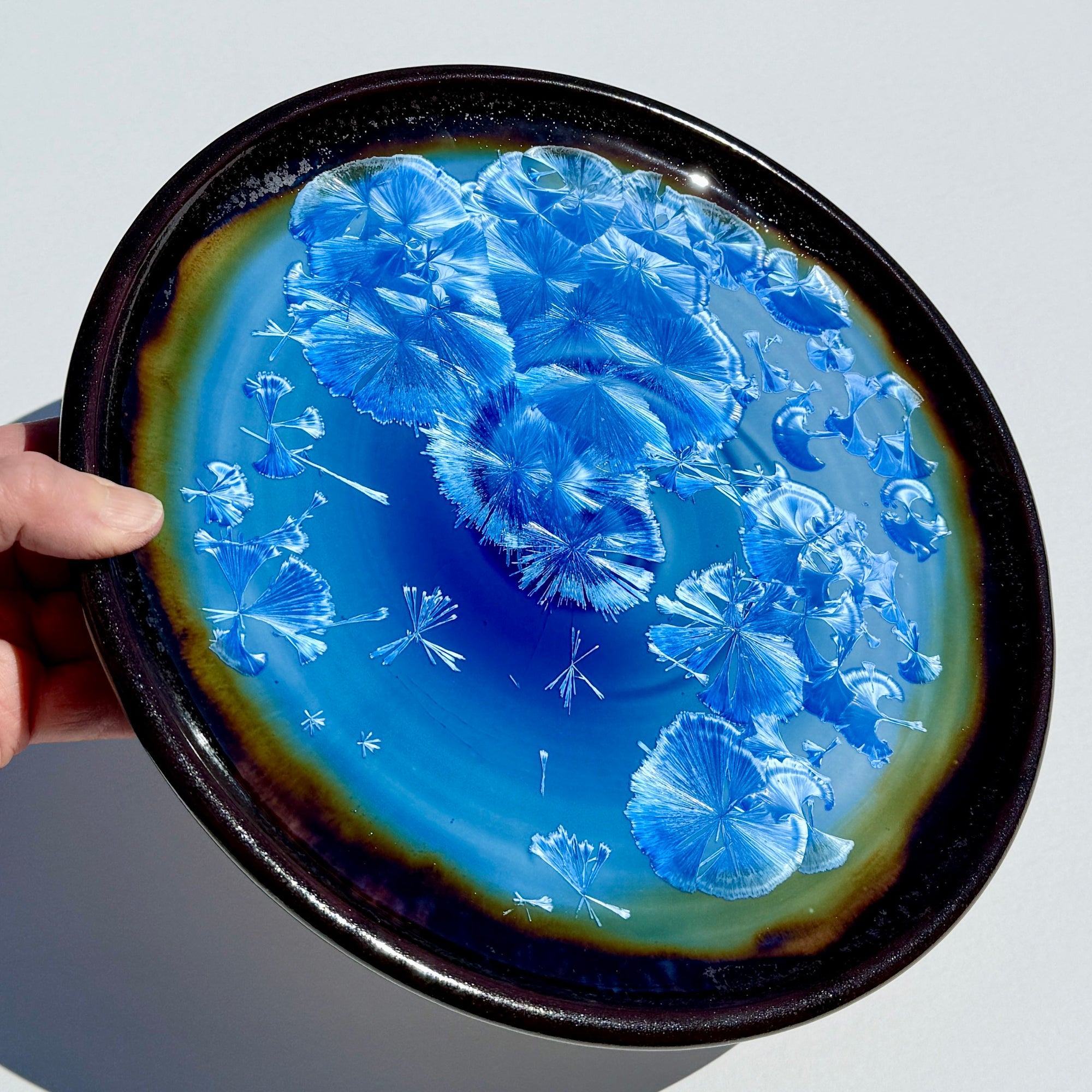 The darker rim is an “oil spot” glaze — which when fired quickly to a high heat, causes iron components to burst to the surface and leave glistening or sparkling highlights. Layered on this is the blue crystalline glaze, which creates a luminescent Northern Lights effect when it melds in the kiln with the darker glaze.